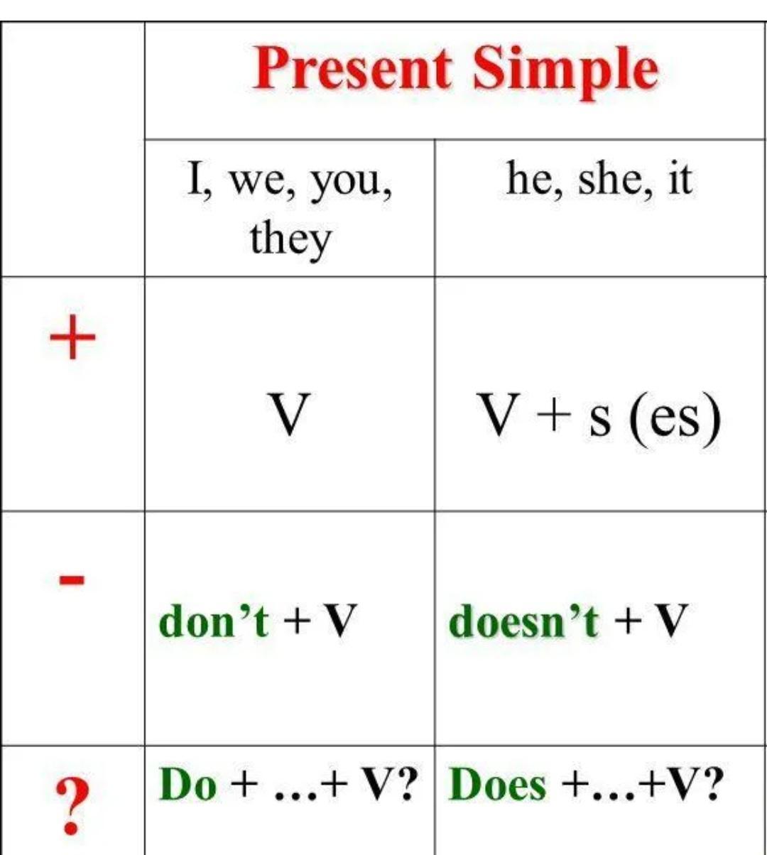 Не забываем добавлять окончание -s к глаголу, если у нас he, she, it. В отрицательной форме вспомогательный глагол "забирает" окончание -s к себе)) Поэтому глагол уже будет без каких-либо окончаний. В таблице V - это глагол (verb).