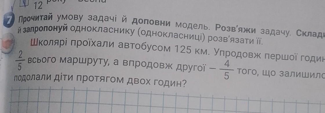 Прочитаи умову задачі й доповни модель. Розв'яжи задачу. Склади до неi обернену запропонуй однокласнику (однокласниці) розв'язати її Школярі проїхали автобусом 125 км. Упродовж першої години вони проїхали всього маршруту, а впродовж другої 4 - того, що залишилося. Яку відстань 5 подолали діти протягом двох годин? помогите срочно