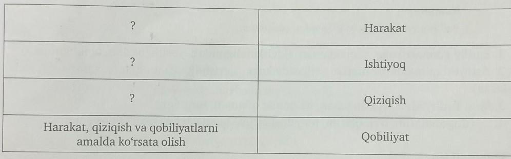? ? ? Harakat, qiziqish va qobiliyatlarni amalda ko'rsata olish Harakat Ishtiyoq Qiziqish Qobiliyat