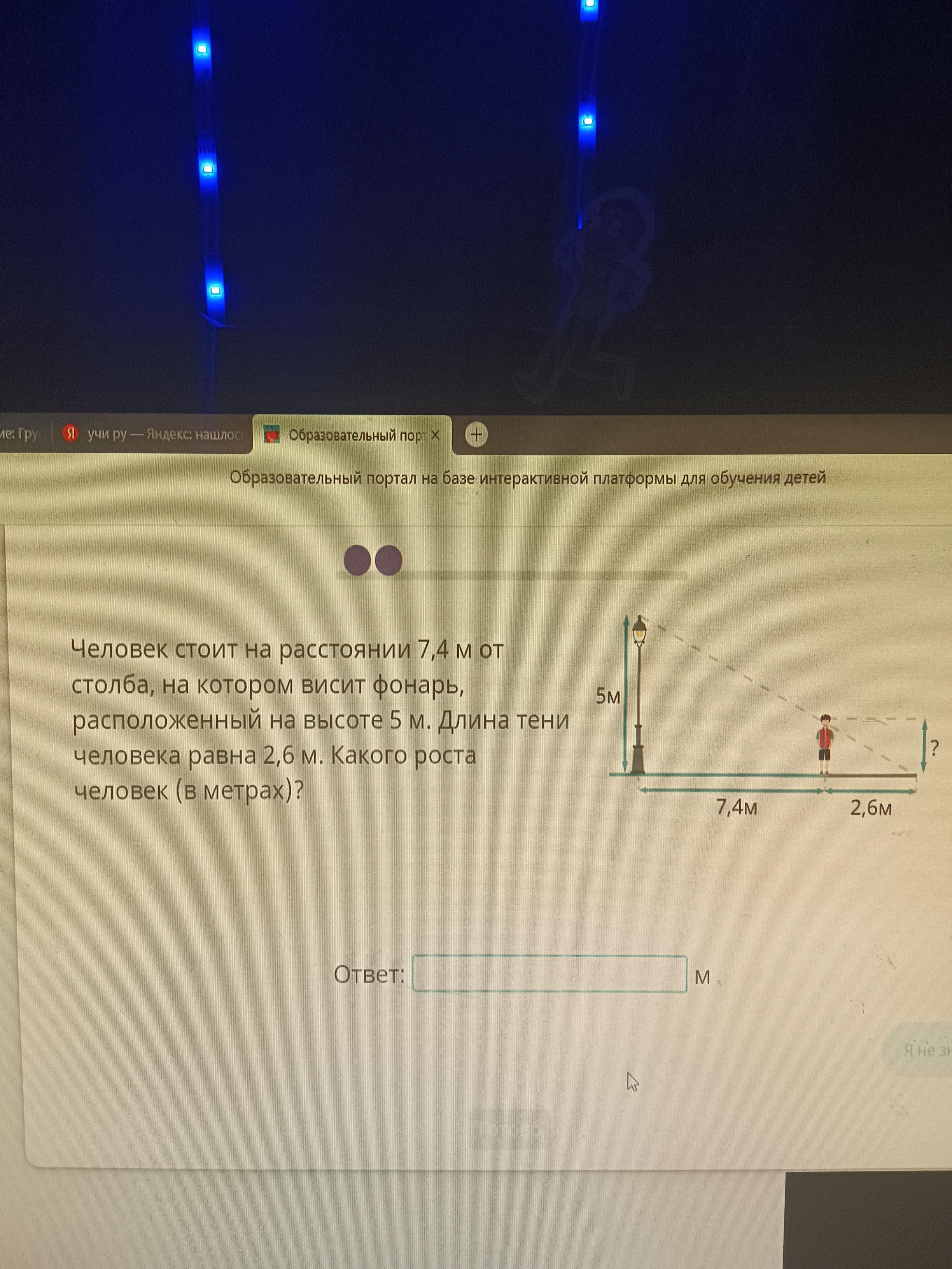 Помогите пожалуйста!!!!!!!!! Человек стоит на расстоянии 7,4 от столба на которой висит фонарь расположен на высоте 5 м длина тени человека равна 2,6 м Какого роста человек в метрах