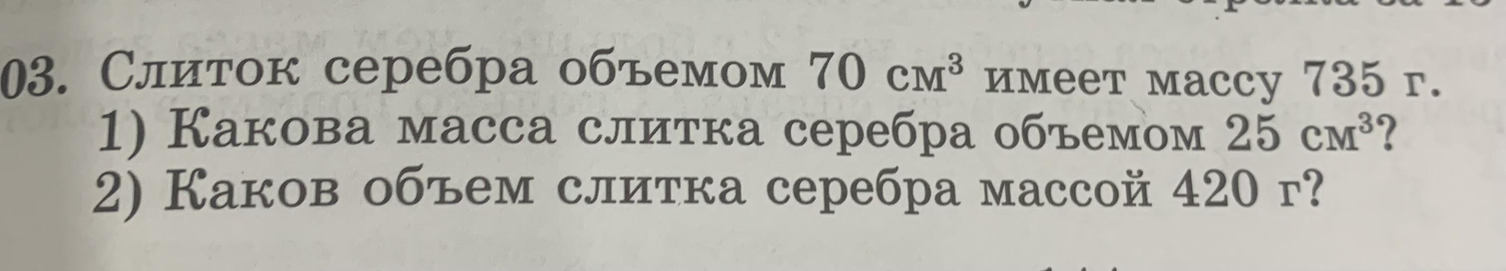 1) Узнаем какова масса слитка серебра объемом 25 см3, если слиток объемом 70 см3 имеет массу 735 г: