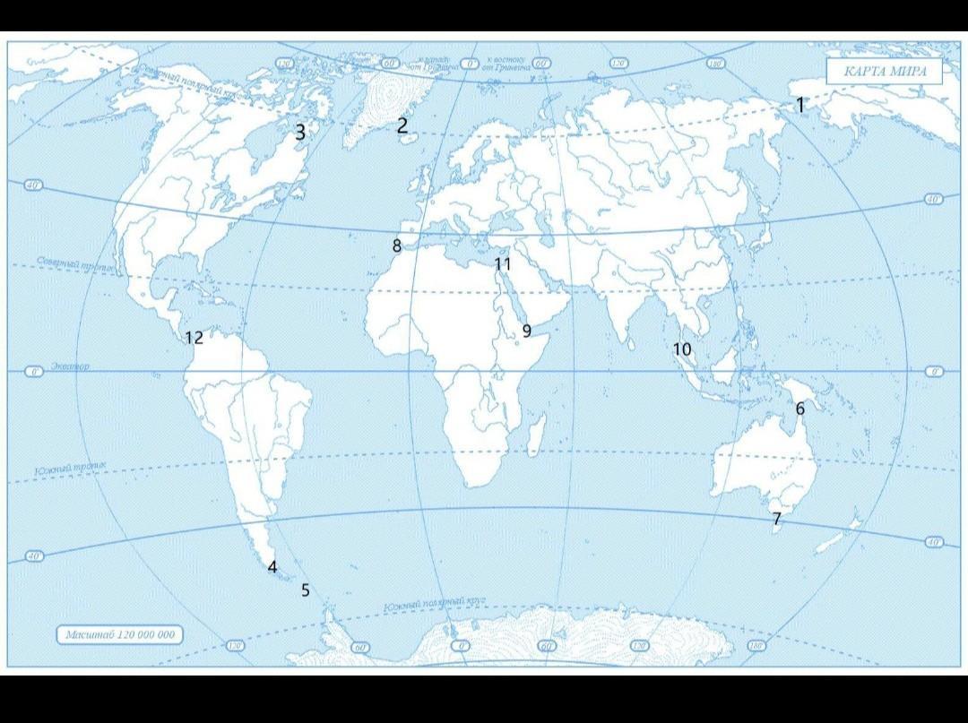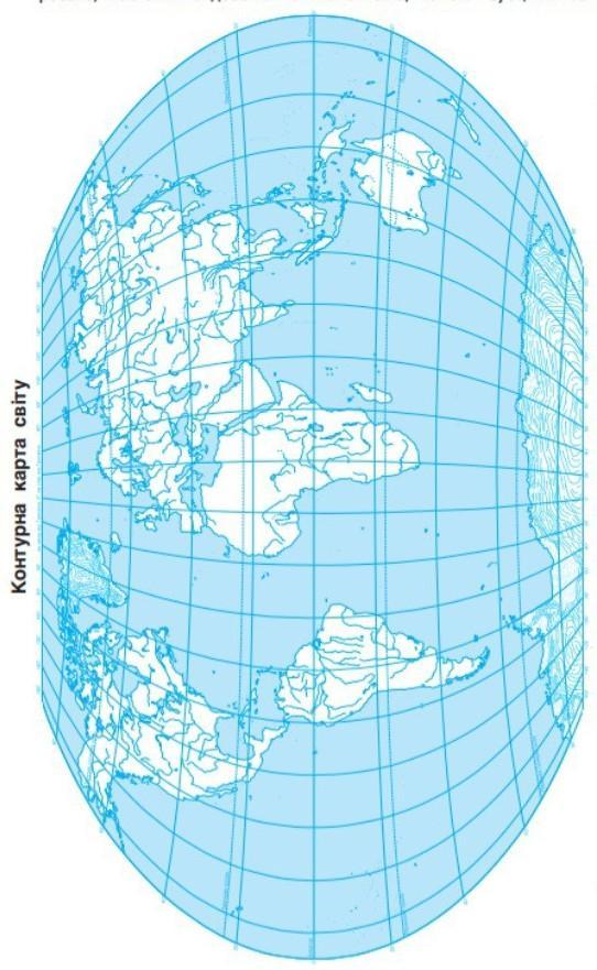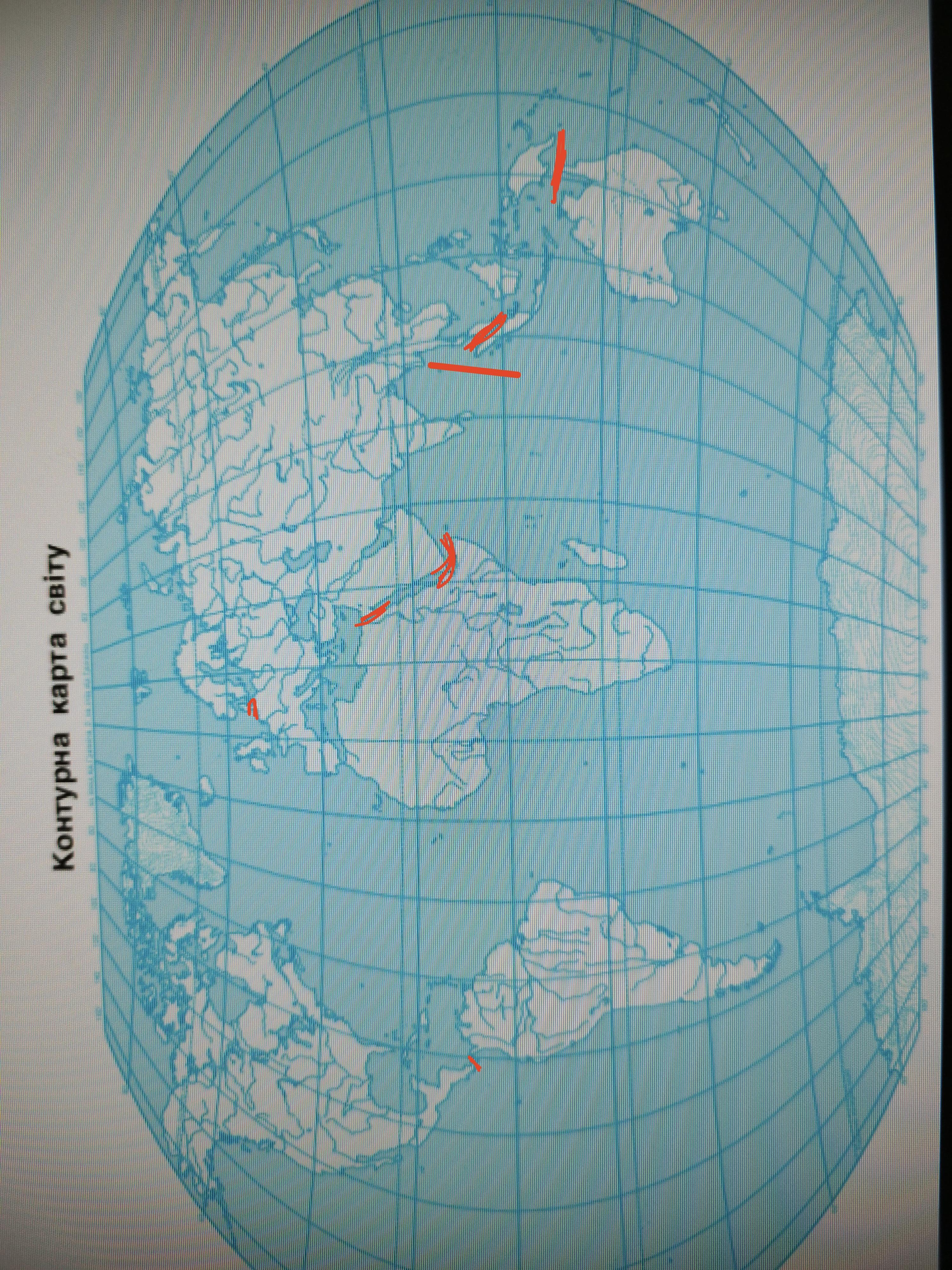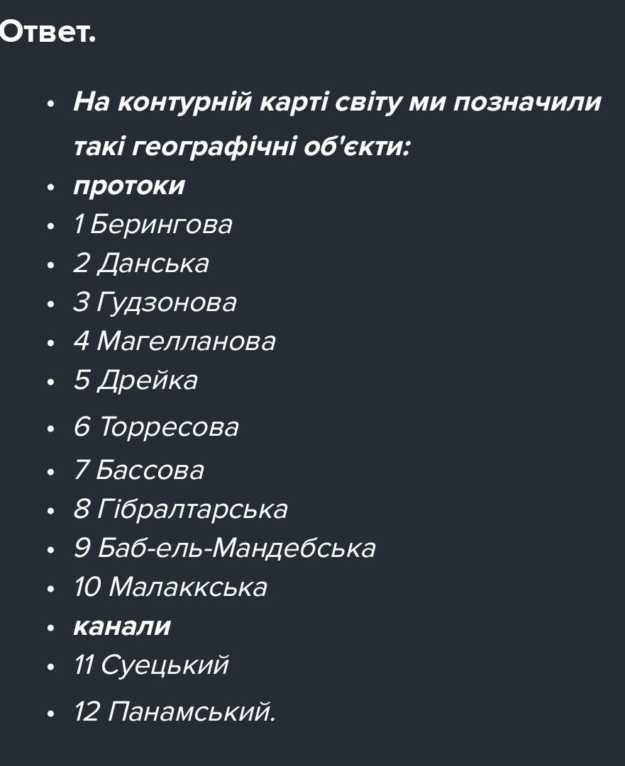 7. Познач на контурній карті світу такі географічні об'єкти: протоки Данська, Тор- ресова, Баб-ель-Мандебська та Малаккська; канали Суецький та Панамський.