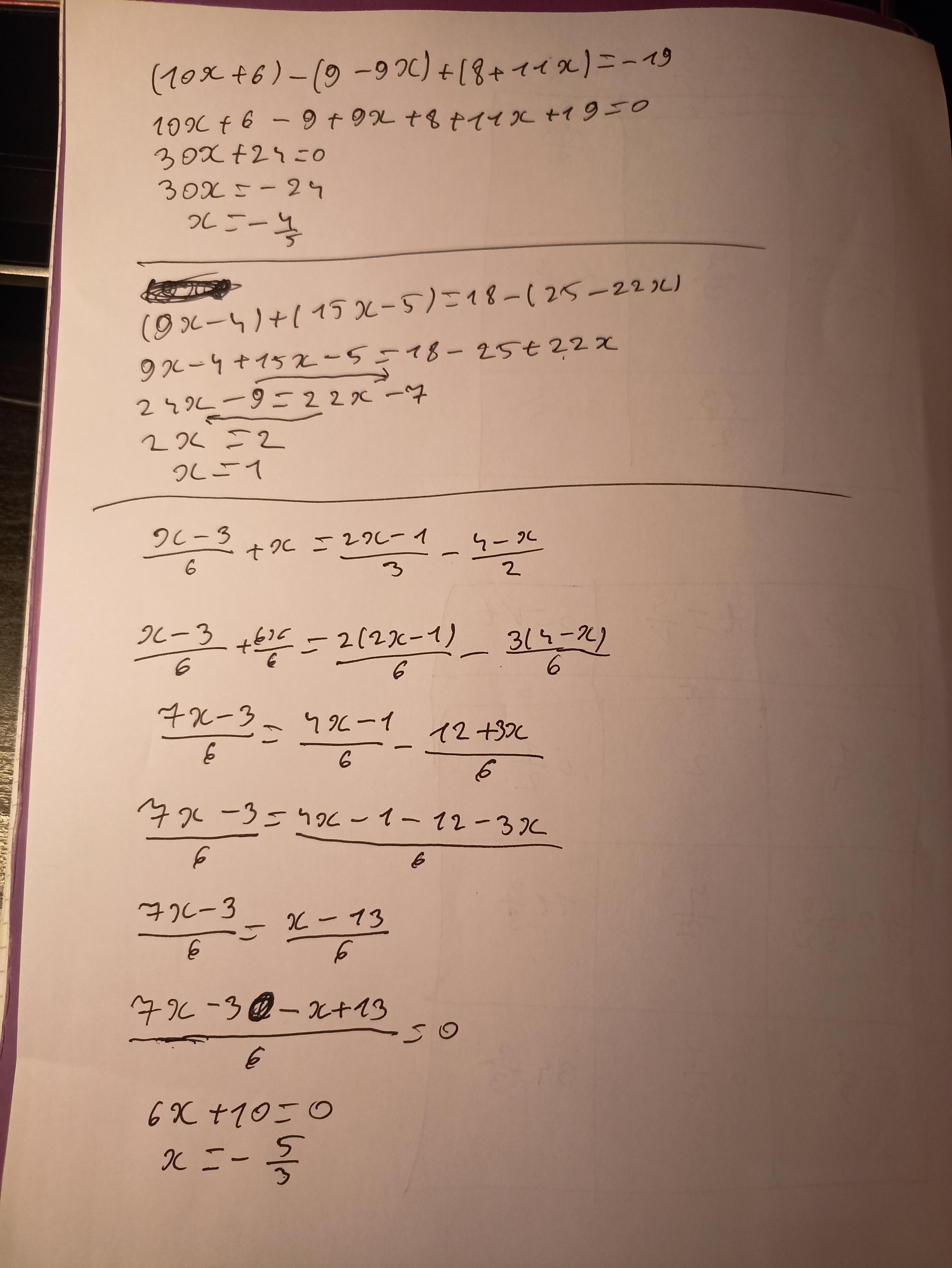Допоможіть будь ласка Розв'язати рівняння (10x + 6) - (9 - 9x) + (8 - 11x)=19 (9x - 4) + (15x - 5) =18-(25-22x(x - 3)/6 + x = (2x - 1)/3 - (4 - x)/2