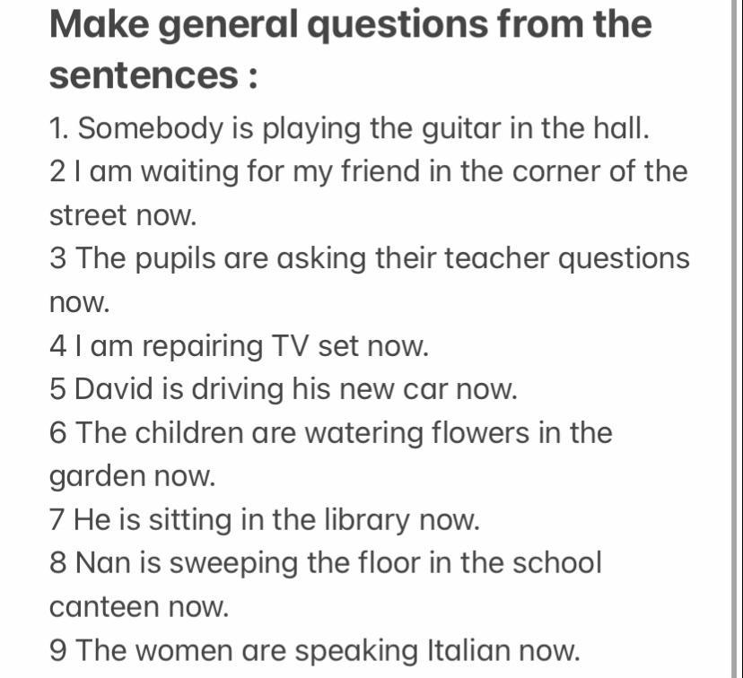 Make general questions from the sentences: 1. Somebody is playing the guitar in the hall. 2 I am waiting for my friend in the corner of the street now. 3 The pupils are asking their teacher questions now. 4 I am repairing TV set now. 5 David is driving his new car now. 6 The children are watering flowers in the garden now. 7 He is sitting in the library now. 8 Nan is sweeping the floor in the school canteen now. 9 The women are speaking Italian now. ДАЮ 50 БАЛОВ ПОЖАЛУЙСТА