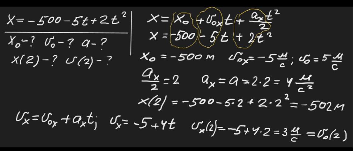 Рівняння руху тіла, яке рухається вздовж осі ОХ, має вигляд х=-500-5t+2t^2 Знайдіть початкову координату тіла, початкову швидкість та прискорення тіла. Визначте координату тіла та його швидкість через 2 с після початку спостереження.