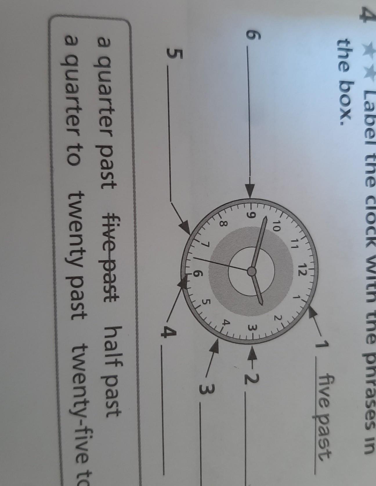 4 ★★ Label the clock with the phrases in the box. five past 6. 5_ 10 9 11 8 요... 12 6 5 2 1 www. 4 2 -3. a quarter past five past half past a quarter to twenty past twenty-five to ДАМ 100БАЛОВ