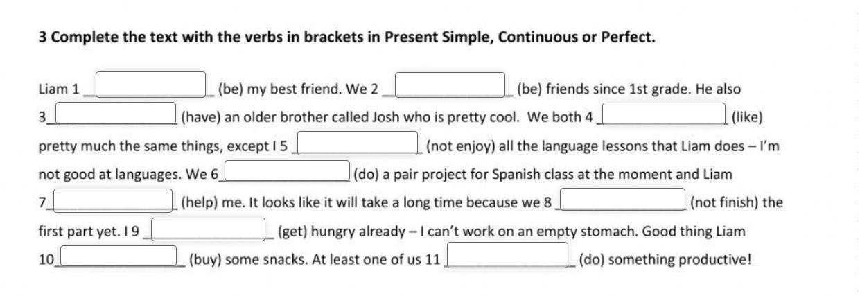 Liam is my best friend. We have been friends since 1st grade. He also has an older brother called Josh who is pretty cool. We both like pretty much the same things, except I don't enjoy all the language lessons that Liam does - I'm not good at languages. We are doing a pair project for Spanish class at the moment, and Liam is helping me. It looks like it will take a long time because we haven't finished the first part yet. I am getting hungry already - I can't work on an empty stomach. Good thing Liam has bought some snacks. At least one of us is doing something productive!