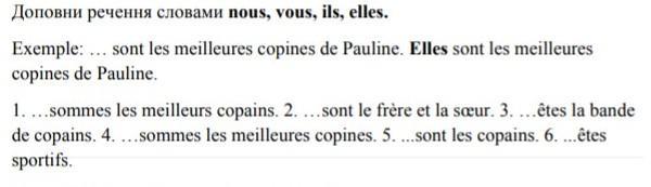 Доповни речення словами поus, vous, ils, elles. Exemple:... sont les meilleures copines de Pauline. Elles sont les meilleures copines de Pauline. 1. ...sommes les meilleurs copains. 2. ...sont le frère et la sœur. 3. ...êtes la bande de copains. 4. ...sommes les meilleures copines. 5. ...sont les copains. 6. ...êtes sportifs.