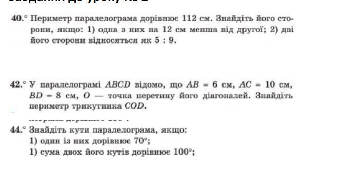 40. Периметр паралелограма дорівнює 112 см. Знайдіть його сто рони, якщо: 1) одна з них на 12 см менша від другої;