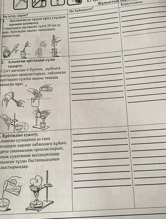 Не істеу керек? 1. Ластанған ас тұзын еріту (тұздын құммен қоспасы). Стакандагы ластанған тұзға 50 мл су кую. Ерiтiндiнi шыны таяқшамен араластыру. 2. Алынған ерітіндіні сүзіп тазарту. Сүзгі кагазды 4 буктеп, куйғыға ылгалдап орналастырып, лайланган ерітіндіні сүзгiге шыны таяқша аркылы кую. иялык тұргы, спиртшам, шырпы. КТ ережелерімен таныстым Жұмыстың барысы Не байкадым? Қорытынды