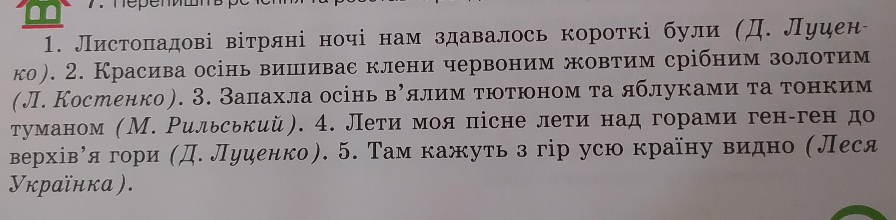 Ответ: 1. Листопадовi, вiтрянi (однорiднi означення) ночi нам, здавалось, (вставне слово) короткi були. 2. Красива осiнь вишивае клени : червоним, жовтим, срiбним, золотим.(однорiднi означення). 3. Запахла осiнь в"ялим тютюном та яблуками, та тонким туманом.(однорiднi додатки). 4. Лети, моя писне, (звернення) лети (однорiднi присудки) над горами, ген-ген (вставне слово) , до верхiв"я гори. 5. Там, кажуть,(вставне слово) з гiр усю краiну видно.