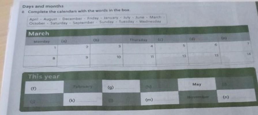 f) January | February | g) March | h) April | May | i) June | j) July | k) August | l) September | m) October | November | n) December