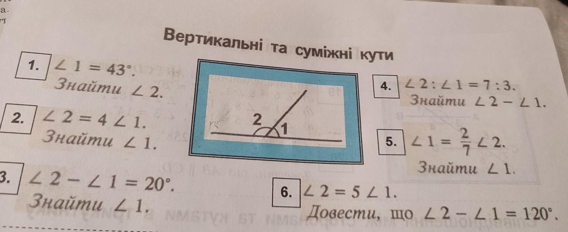 Вертикальні та сумiжнi кути Знайти L 2. 2.42=4 L 1. Знайти L 1. 823 3. L2-L1 = 20°. Знайти 4 1. за 2 do kon 4. 22:21 = 7:3. Знайти 2 2 - 2 1. 5.41 = 2²/74 2. Знайти 2 1. 6.42=521. * NMSTYX ST IДовести, що 4 2 - 2 1 = 120°.