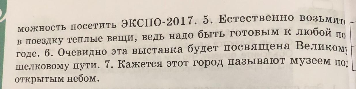 4. Безусловно у отдыхающих в Астане была прекрасная возможность посетить ЭКСПО-2017. 5.Естественно возьмите поездку тёплые вещи,ведь надо быть готовым к любой погоде. 6.Очевидно эта выставка будет посвящена Великому шелковому пути. 7.Кажется этот город называют музеем под открытым небом