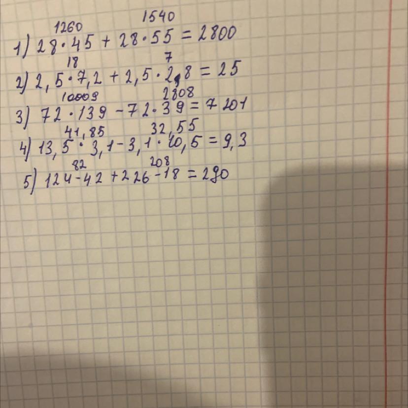 1) 28*45+28*55 2)2,5*7,2+2,5 *2,8 3)72*139-72*39 4) 13,5*3,1-3,1*10,5 5)124-42+226-18 6) 2,51-4,41+3,49-6,59 7) 91+117+9+83 8) 31,11+42,89-1,8-5,2. Срочно