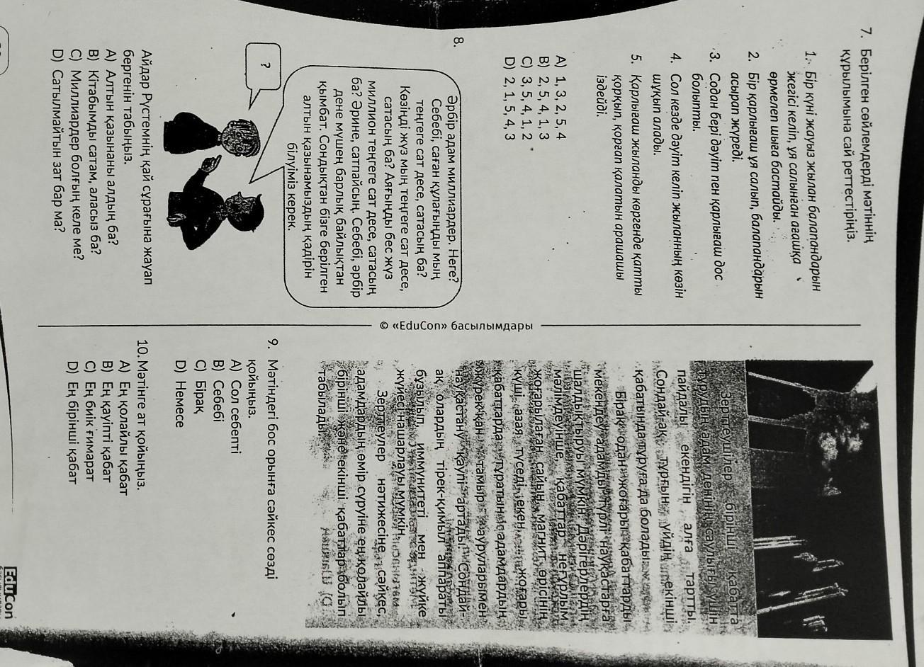 Жамандықтар вирус тәрізді. Вирусқа дер кезінде «ұят» деп аталатын қолданбасақ, онда денеміздегі ең маңызды болған «жүрегіміз» ауруға ұшырайды. Егер журек ауру болса, букіл денемiз кеселге шалдыкты деген сөз. Сондықтан дер кезінде «тазарту» процесін жасап, өзімізді «жамандық» аммы вирустан сақтап жүруіміз керек. 4. Мәтіндегі көп нүктенің орнына сәйкес сөзді қойыңыз. А) Вирус В) Антивирус С) Дәрі D) Шәлі *** 5. Мәтінге қандай тақырып коюға болады? A) Ауру адам В) «Ұят» антивирусы C) «Каспер» антивирусы Вирус 6. Мәтіннің идеясы неде? А) Жамандықтан сактанып жүру. В) Соңғы үлгімен жаңаланып жүру. С) Ауырмау үшін дер кезінде дәрігерге бару. D) Компьютерлік бағдарламаны жетік меңгеру.