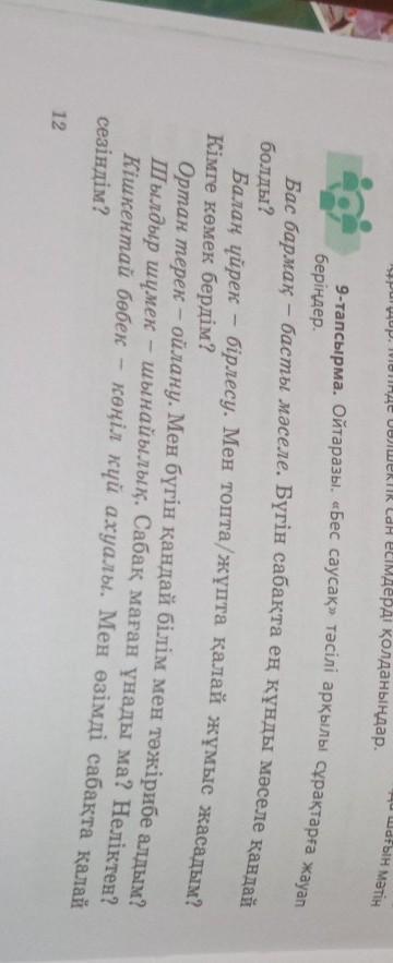 9-тапсырма. Ойтаразы. «Бес саусақ» тәсілі арқылы сұрақтарға жауап беріңдер. болды? Бас бармақ – басты мәселе. Бүгін сабақта ең құнды мәселе қандай Балаң үйрек — бірлесу. Мен топта/жұпта қалай жұмыс жасадым? Кімге көмек бердім? Ортан терек – ойлану. Мен бүгін қандай білім мен тәжірибе алдым? Шылдыр шүмек - шынайылық. Сабақ маған ұнады ма? Неліктен? Кішкентай бөбек — көңіл күй ахуалы. Мен өзімді сабақта қалай сезiндiм? МӘТІН