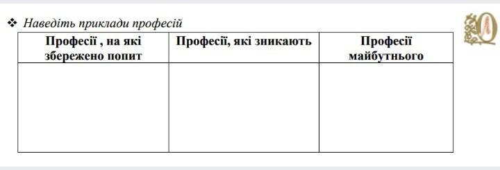 1 колонка де попит-програмісти,лікарі ,медичні працівники 2 колонка де професії зникають-бухгалтера,копірайтера,бібліотекаря 3 колонка де професії майбутнього-онлайн вчитель,сіті фермер, дієтолог,молекулярний