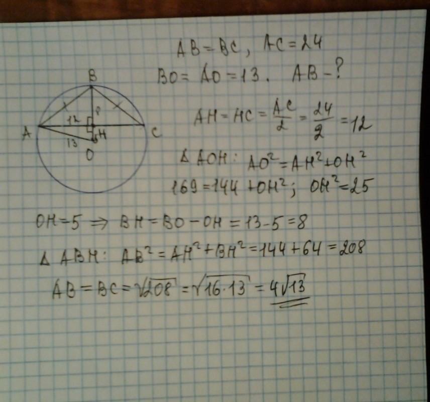 основа рівнобедреного трикутника дорівнює 24 см а радіус кола описаного навколо нього 13 см знайдіть площу трикутника