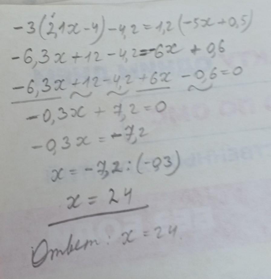 -3(2,1х-4)-4,2=1,2(-5х +0,5)