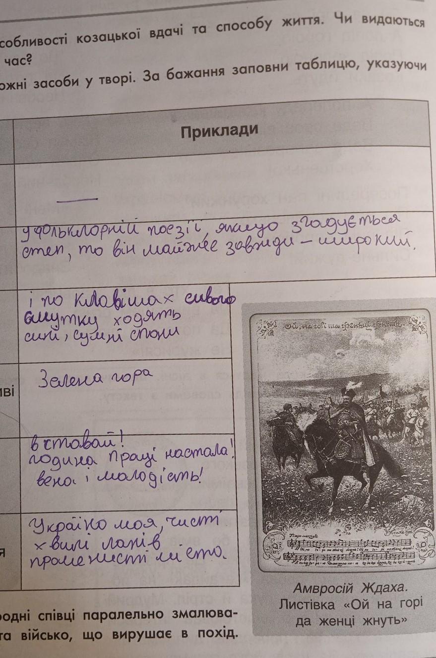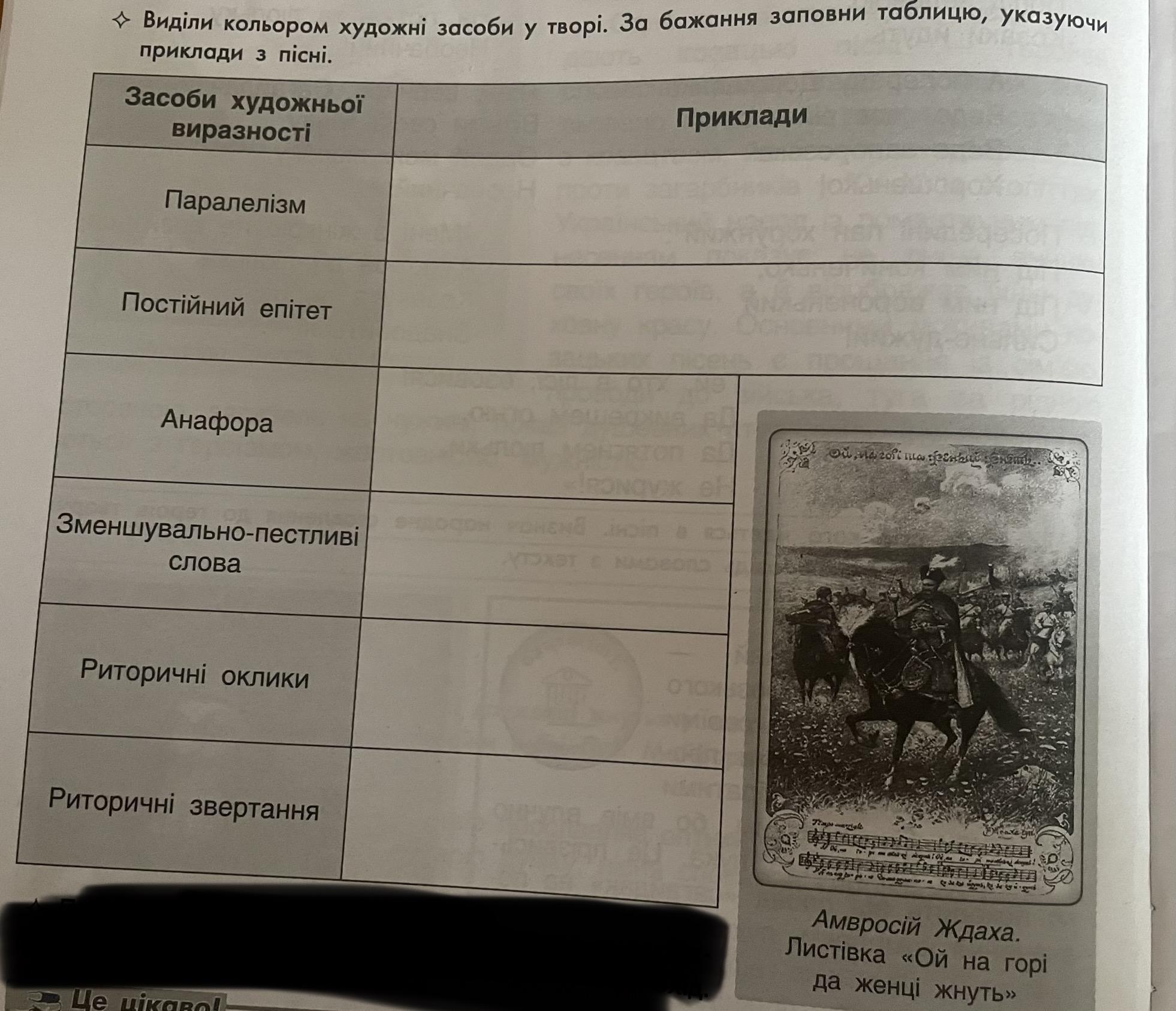 Виділи кольором художні засоби у творі. За бажання заповни таблицю, указуючи приклади з пісні