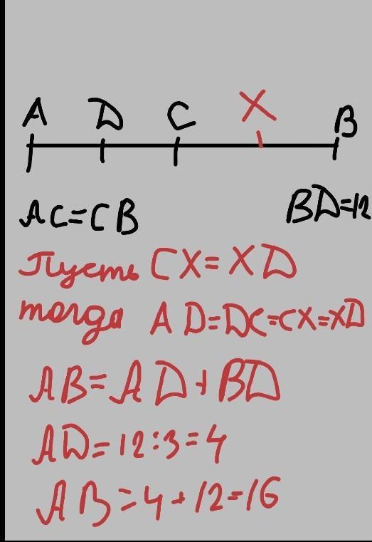 Точка С- середина відрізка АВ,а точка D середина відрізка АС,знайдіть довжину відрізка, AB якщо BD=12см