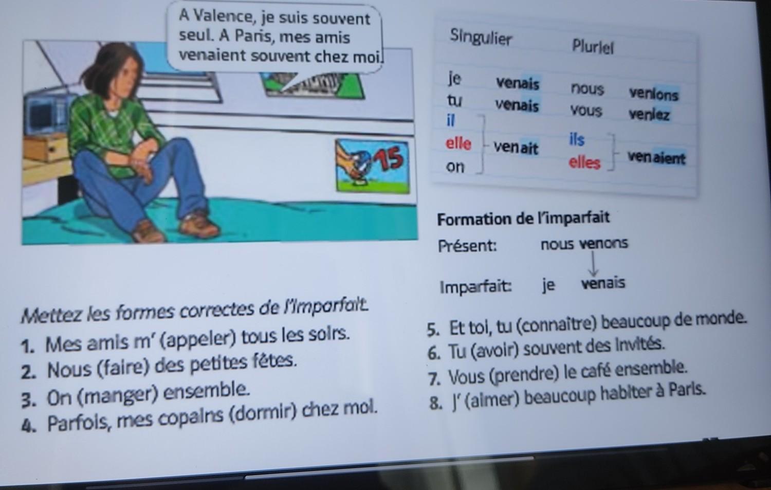 Mettez les formes correctes de l'imparfait 1. Mes amis m' (appeler) tous les soirs. 2. Nous (faire) des petites fêtes. 3. On (manger) ensemble. 4. Parfois, mes copains (dormir) chez mol. 5. Et toi, tu (connaître) beaucoup de monde. 6. Tu (avoir) souvent des invités. 7. Vous (prendre) le café ensemble. 8. J' (almer) beaucoup habiter à Paris.
