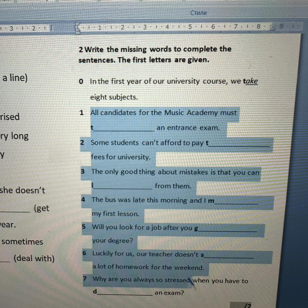 1. took; 2. taxes; 3. learn; 4. missed; 5. get; 6. send; 7. do.