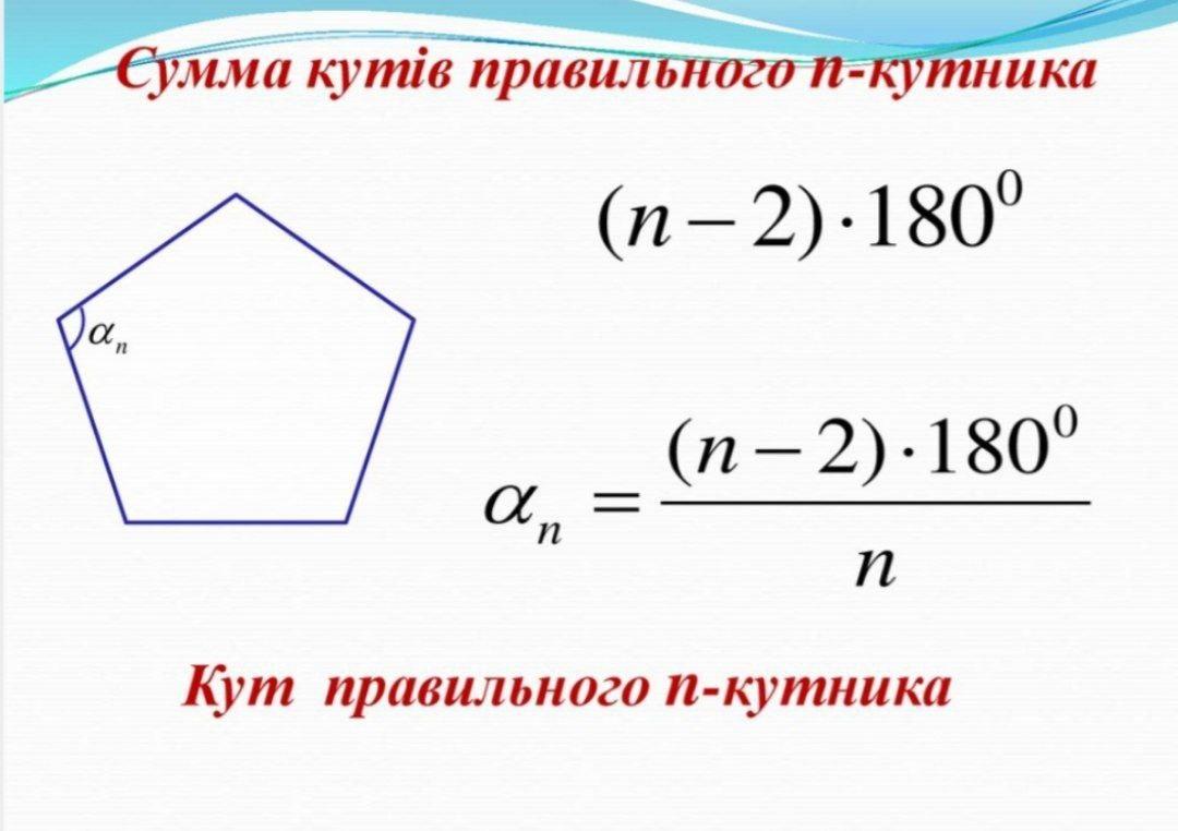 Сума кутів правильного n-кутника обчислюється за формулою: (n-2)·180°, де n - це кількість сторін у полігоні.