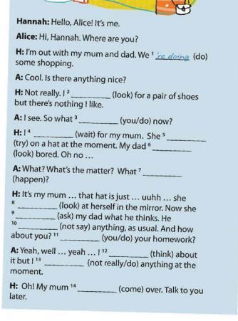 Ответ: 2)I'm looking 3)are you doing 4 I'm waiting 5)She's trying 6)My dad is looking 7) happening 8)she's looking 9)she's asking 10)he's not saying 11)Are you doing 12)I'm thinking 13)I'm not really doing 14)is coming