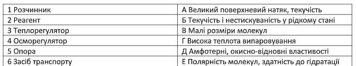 Поєднайте правильно властивості води і її біологічне значення. Відповідь напишіть тільки цифра і буква. Приклад : 1-А