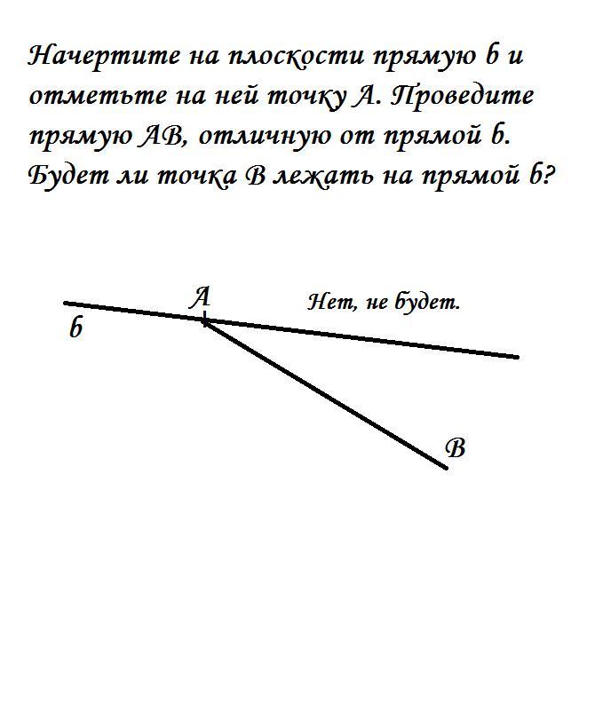7. Начертите на плоскости прямую ь и отметьте на ней точку А. Проведите прямую АВ, от- личную от прямой ь. Будет ли точка В лежать на прямой b?