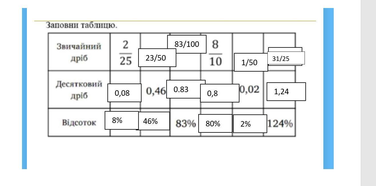 124% => 124/100 = 31/25 = 1 6/25 => 124 : 100 = 1,24