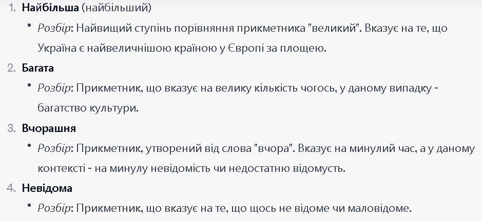 Україна - найбільша країна у Європі. Країна з багатою культурою, вчорашньою невідомістю і сьогоднішньою визначеністю у майбутньому. виписати прикметники, зробити розбір