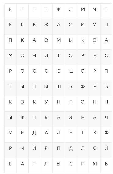 Аня и Вася знают, что код спрятан в таблице. Слово состоит из 7 букв, первая и последняя буквы согласные, гласных в слове две. Слова могут идти слева направо, справа налево, сверху вниз и снизу вверх, но только по прямой, а не по диагонали. Среди слов нет сокращений и аббревиатур.