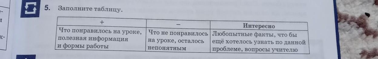5. Заполните таблицу. Интересно Что понравилось на уроке, Что не понравилось Любопытные факты, что бы полезная информация на уроке, осталось непонятНЫМ ещё хотелось узнать по данной проблеме, вопросы учителю и формы работы +