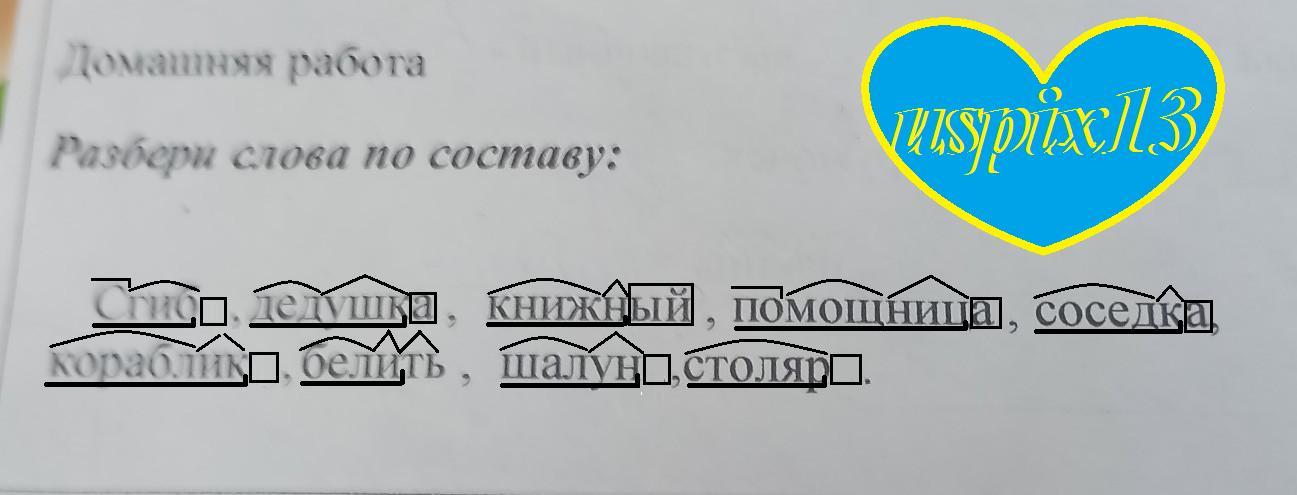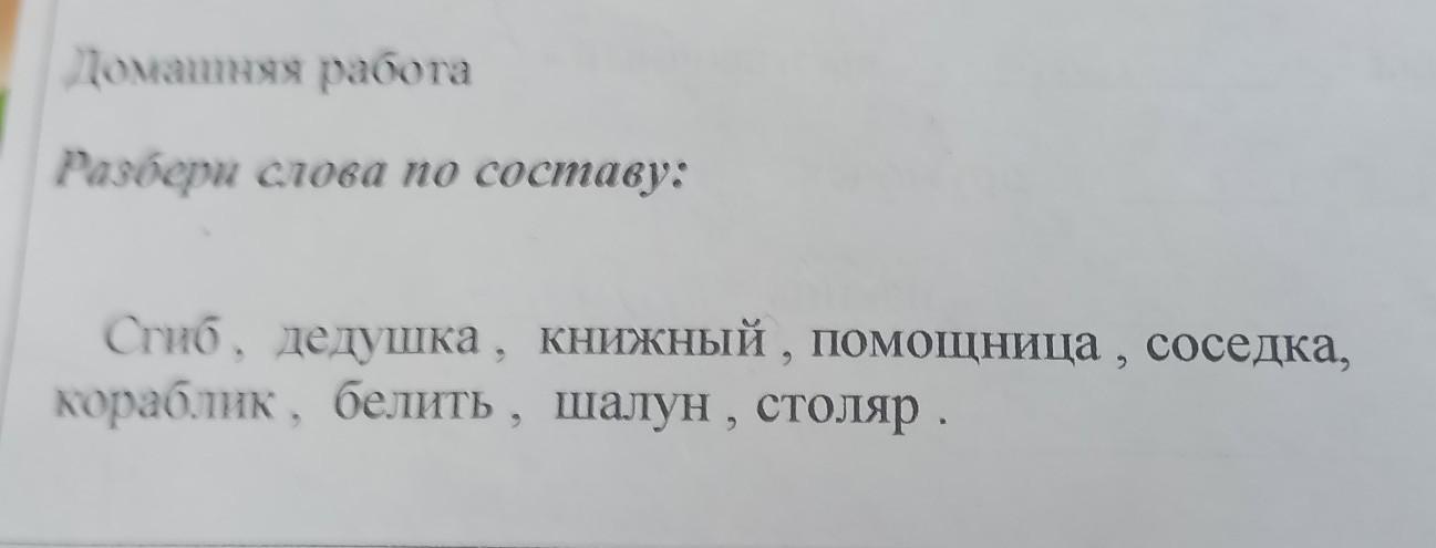 Разбери слова по составу: Сгиб, дедушка, книжный, помощница, соседка, кораблик, белить, шалун, столяр.