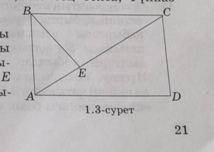 34. ABCD тік төртбұрышынын узындыгы 15 см, ені 8 см (1.3-сурет). ABE үшбұрышы ВСЕ ушбұрышы ауданы- ауданының B на катынасы 2:3 қатынасындай. АВЕ ушбұрышының ауданын, ВСЕ үшбұры- А шының ауданын табыңдар.