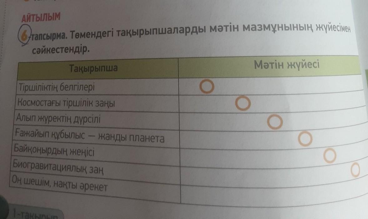 АЙТЫЛЫМ 6-тапсырма. Темендегi такырыпшаларды мәтін мазмұнының жүйесімен сәйкестендір. 8 класс