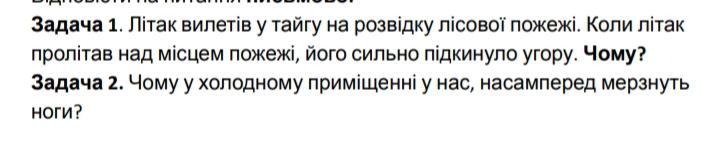 Задача 1: Коли літак пролітав над місцем пожежі, його сильно підкинуло угору через ефект теплової зупинки або стовп теплого повітря, який утворюється над гарячою пожежею. Це стається через те, що гаряче повітря має нижчу щільність, ніж навколишнє холодне повітря, тому воно піднімається вгору, створюючи стовп.