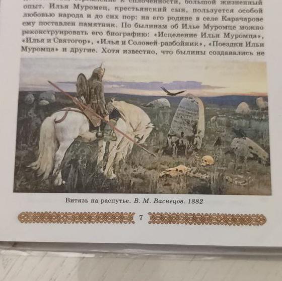 На картине В М Васнецов "витязь на распутье" написаной в 1882 году мы видим сына крестьянского. Его конь уставший как и сам герой. Илья святогор подошёл на своём коне к памятнику возле которого его поджидает трудный выбор. Он не хочет решать, поскольку очень устал и совсем одинок. Васнецов передал нам это чувство красками, тонами картины. Выразил каждую деталь. Мне понравилась эта картина, тем что автор изобразил все до единой детали.