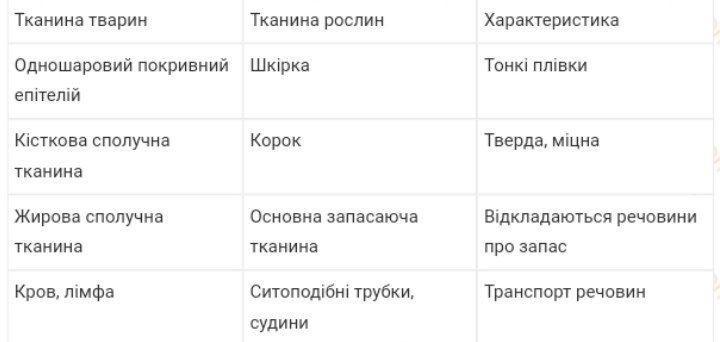 ПОРIВНяйте функцiї i будову тканин організму людини з функцiями і будовою тканин рослин. Виявіть тканини людини і рослин, які виконують подібні функції. Відповідь оформİть у вигляді таблиці.