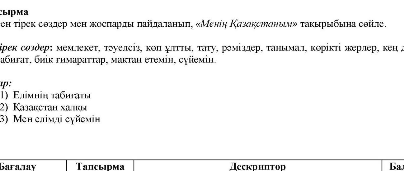 Біздің мемлекетіміз Қазақстан.Біз тәуелсіз елміз.Көп ұлтты халықпыз.Біздің өз рәміздеріміз бар,олар ту,гимн,елтаңба.Қазақстанда танымал адамдар көп.Қазақстанның көрікті жерлері Бурабай ұлттық саябағы,Хан тәңірі шыңы,Сауыр-Тарбағатай,Каспий теңізі бар.Біздің табиғатымыз әдемі.Біздің қалам ызда биік ғимараттар көп.Мен өз елімді мақтан етемін.
