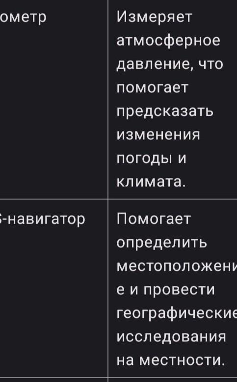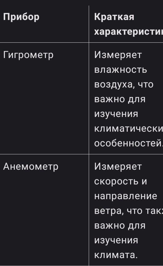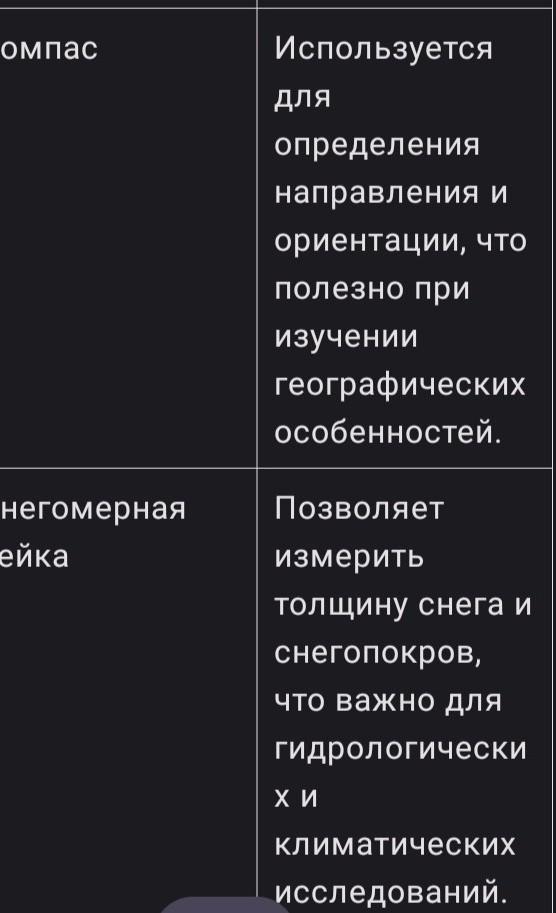 5. Школьники Даша и Егор собираются в летний географический лагерь. Им предстоит провести время на берегу озера Зайсан, изучая климатические и гидрологические особенности региона. Ниже перечислено несколько при- боров. Какие из них пригодятся ребятам непосредственно для решения их задач? Внесите названия "полезных" приборов в таблицу, дав каждому из нихэхолот, анемометр, гигрометр, снегомерная рейка, бур, GPS-навигатор, компас, краткую характеристику: курвиметр, осадкомер, барометр, флюгер, нивелир, буссоль, сейсмограф. Прибор Измеряемая характеристика Единица измерения.