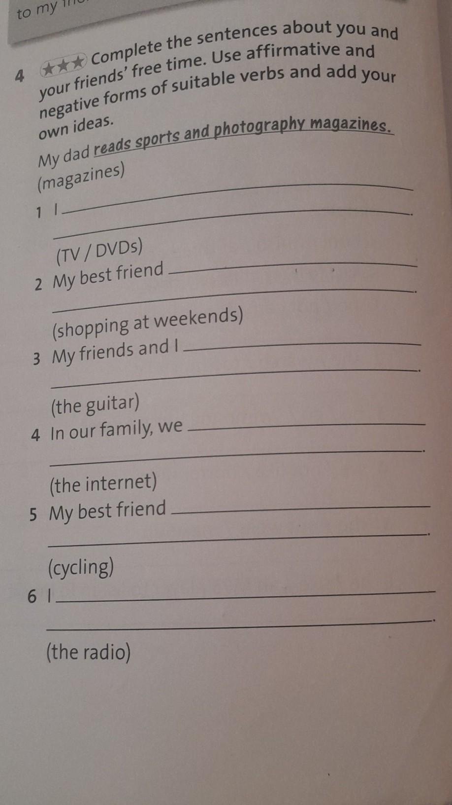 4 ✰✰✰ Complete the sentences about you and your friends' free time. Use affirmative and negative forms of suitable verbs and add your own ideas. My dad reads sports and photography magazines. (magazines) 11- (TV/DVDs) 2 My best friend (shopping at weekends) 3 My friends and I (the guitar) 4 In our family, we (the internet) 5 My best friend (cycling) 6 1 (the radio)