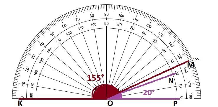 Будуємо промінь ОK. Потім треба прикласти транспортир так, щоб його центр співпав з точкою О, а промінь ОК пройшов через початок відліку шкали транспортира. Далі поставити точку М проти поділки 155° і провести промінь ОМ. ∠КОМ = 155°
