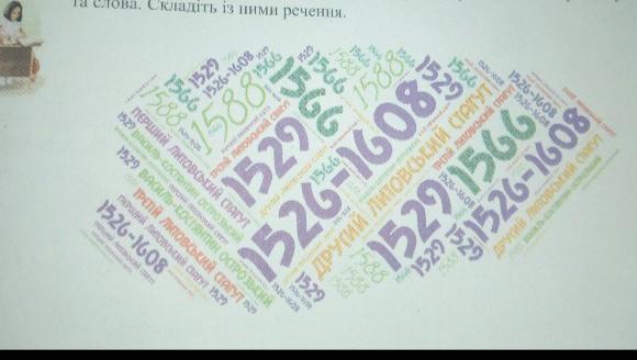 Уважно розгляньте хмаринку подій. Випишіть у зошит із хмаринки роки та слова. Складіть із ними речення.