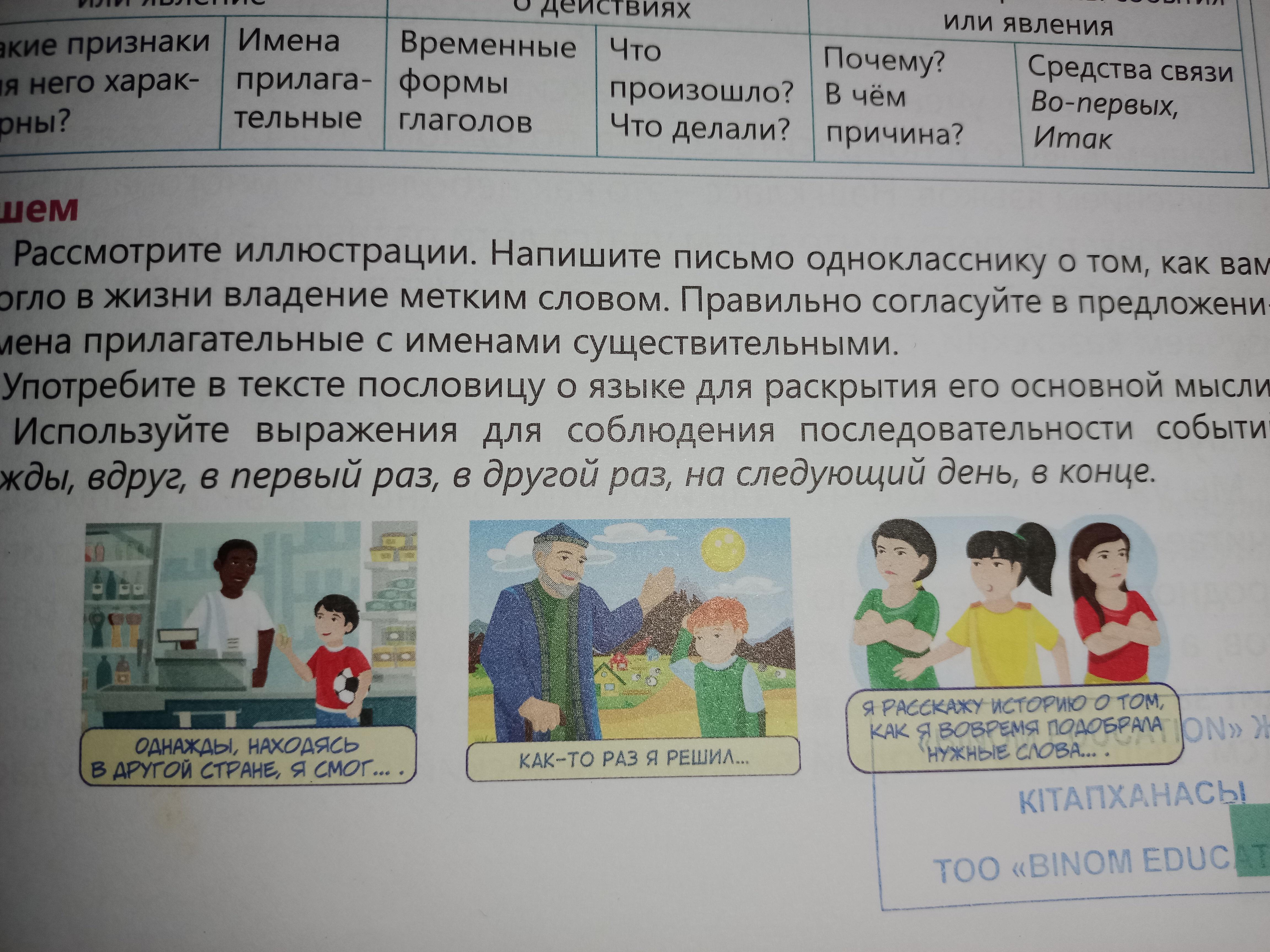 8. Рассмотрите иллюстрации. Напишите письмо однокласснику о том, как вам помогло в жизни владение метким словом. Правильно согласуйте в предложении имена прилагательные с именами существительными.