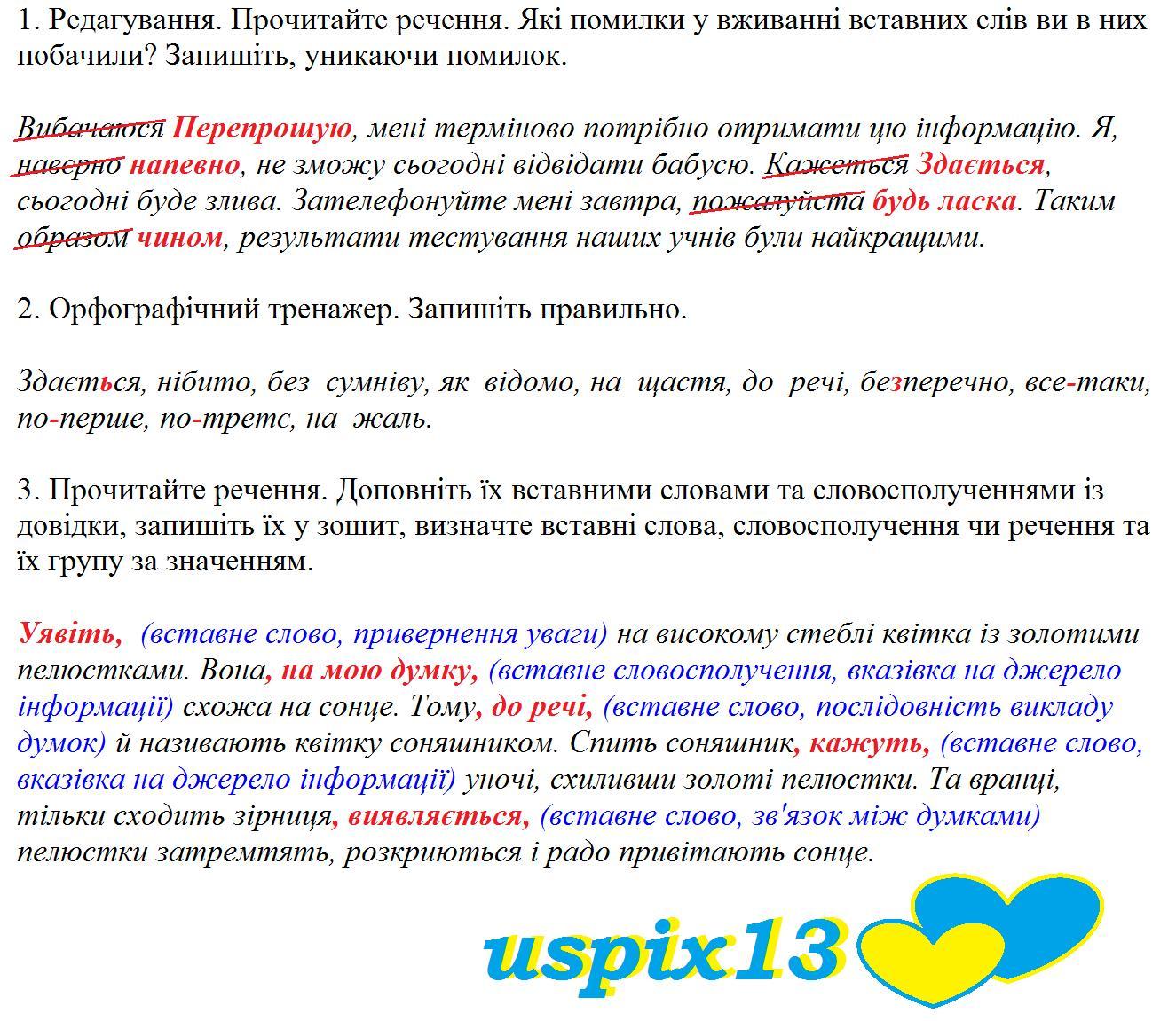 1. Редагування. Прочитайте речення. Які помилки у вживанні вставних слів ви в них побачили? Запишіть, уникаючи помилок. Вибачаюся, мені терміново потрібно отримати цю інформацію. Я, навєрно, не зможу сьогодні відвідати бабусю. Кажеться, сьогодні буде злива. Зателефонуйте мені завтра, пожалуйста. Таким образом, результати тестування наших учнів були найкращими. 2. Орфографічний тренажер. Запишіть правильно. Здаєт..ся, ніби/то, без/ сумніву, як/ відомо, на/щастя, до/речі, бе(з, с)перечно, все/таки, по/перше, по/третє, на/жаль. 3. Прочитайте речення. Доповніть їх вставними словами та словосполученнями із довідки, запишіть їх у зошит, визначте вставні слова, словосполучення чи речення та їх групу за значенням. На високому стеблі квітка із золотими пелюстками. Вона схожа на сонце. Тому й називають квітку соняшником. Спить соняшник уночі, схиливши золоті пелюстки. Та вранці, тільки сходить зірниця, пелюстки затремтять, розкриються і радо привітають сонце (). Довідка: виявляється, до речі, уявіть, на мою думку, кажуть.