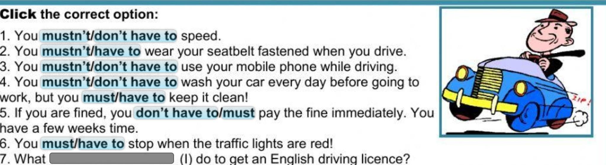1. You mustn't/don't have to speed. 2. You mustn't/have to wear your seatbelt fastened when you drive. 3. You mustn't/don't have to use your mobile phone while driving. 4. You mustn't/don't have to wash your car every day before going to work, but you must/have to keep it clean! 5. If you are fined, you don't have to/must pay the fine immediately. You have a few weeks time. 6. You must/have to stop when the traffic lights are red! 7. What (I) do to get an English driving licence? LAS